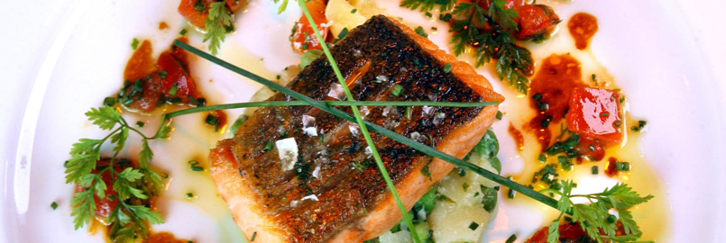 Pan-fried Finn salmon with peas, crushed new potatoes and sauce vierge